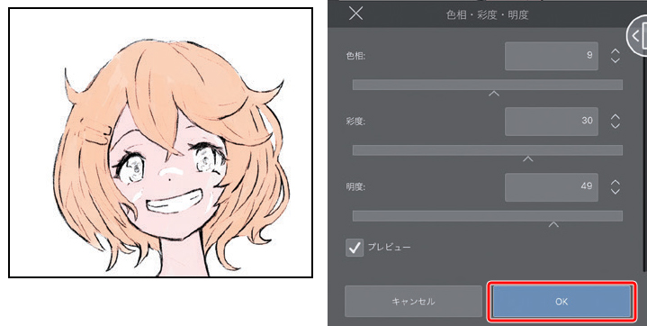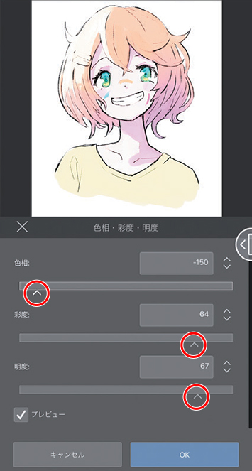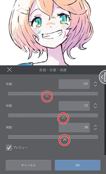 今度は「顔」レイヤーに切り替えて、メニューアイコンから[編集]→[色調補正]→[色相・彩度・明度]を選択して、色相を少し変えつつ彩度と明度を高くしてみました。