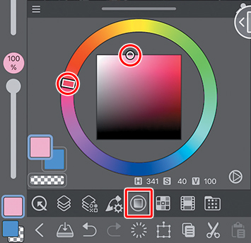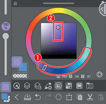 カラーサークルアイコン①をタップするとカラフルなリングと正方形が出てくるので、スライダー②を調整して色を選びます。