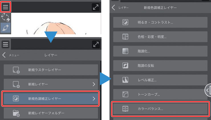 メニューアイコン→[レイヤー]→[新規色調補正レイヤー]→[カラーバランス]を選択してカラーバランスの色調補正レイヤーを作成します。