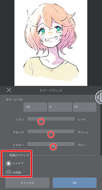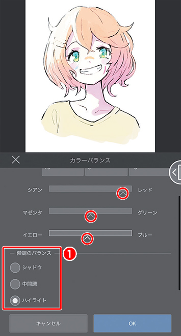 最終的に、ハイライトを赤色(レッド)っぽく、シャドウを少し水色(シアン)多めにしてみました。