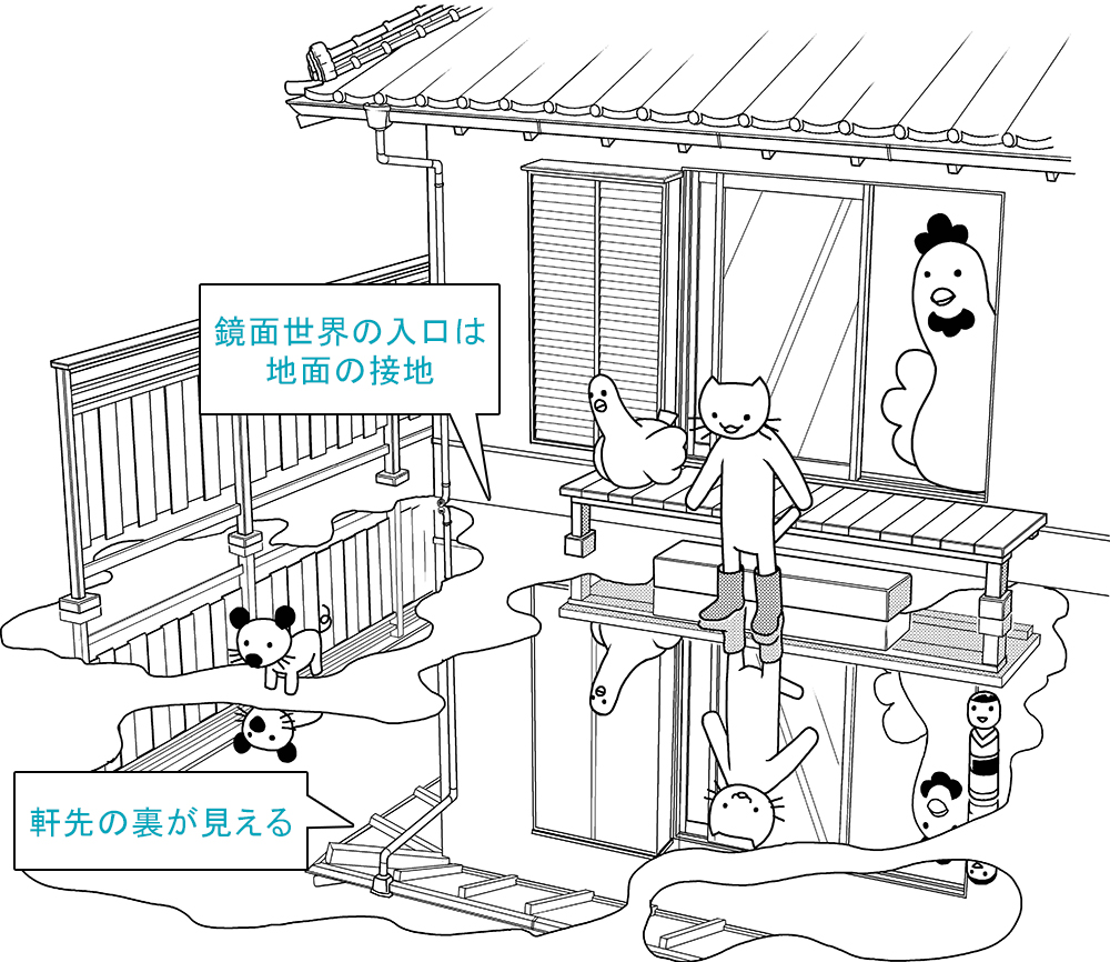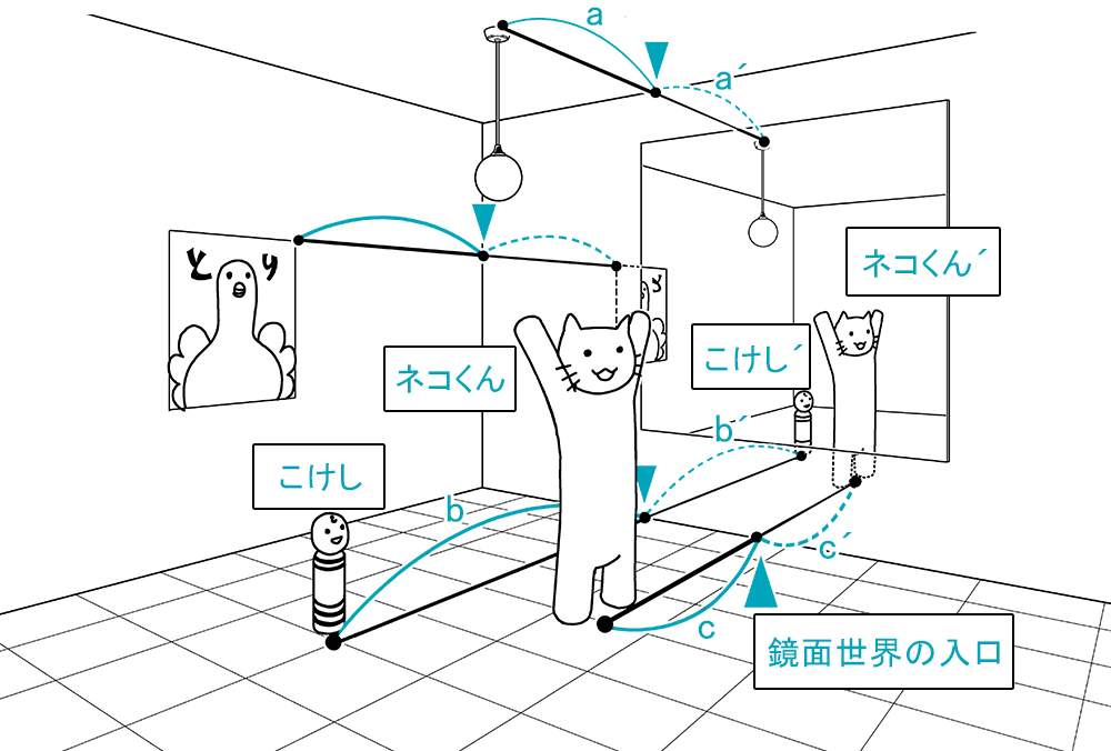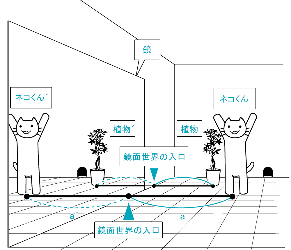 ネコくんから鏡までの距離(a)をパース上で2倍の長さ(a’)にするとネコくん’が爆誕。