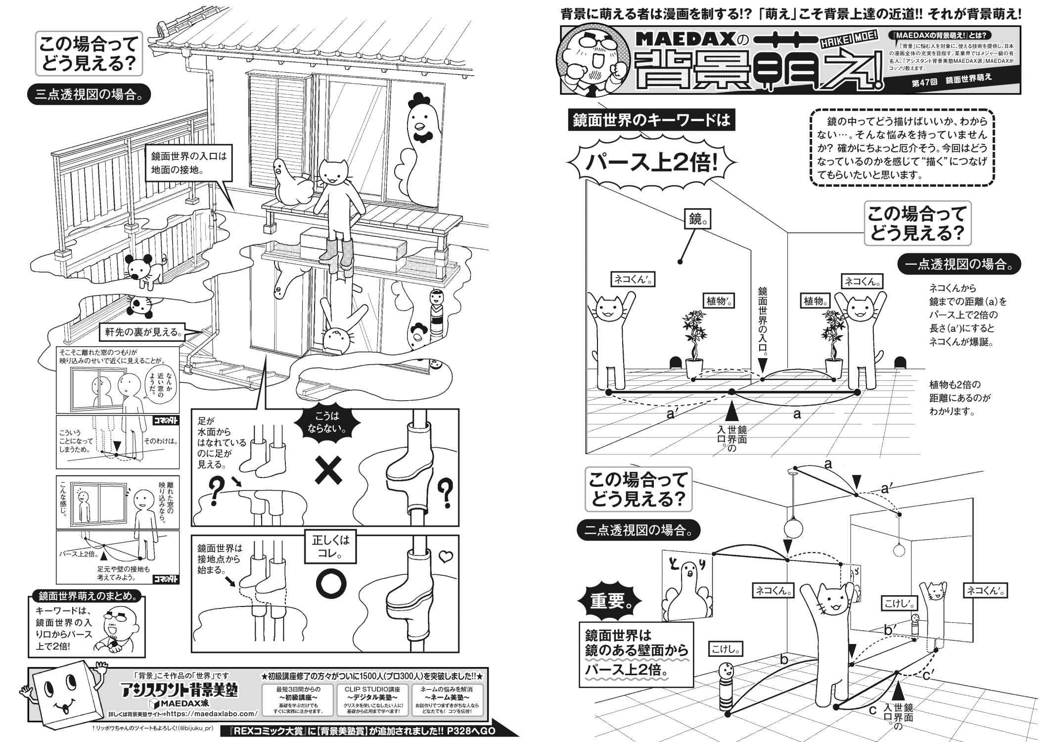 「MAEDAXの背景萌え!」とは? 「背景」に悩む人を対象に、使える技術を提供し、日本の漫画全体の充実を目指す。某業界ではメジャー級の有名人、「アシスタント背景美塾MAEDAX派」MAEDAXがコッソリ教えます。今回は鏡面世界編!