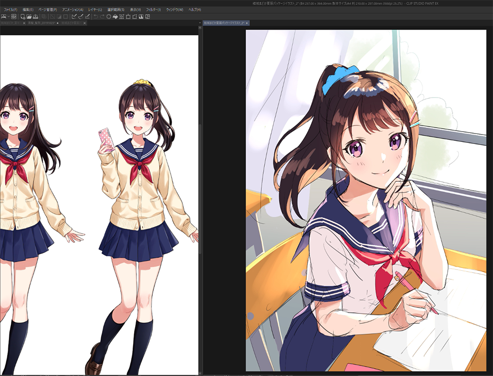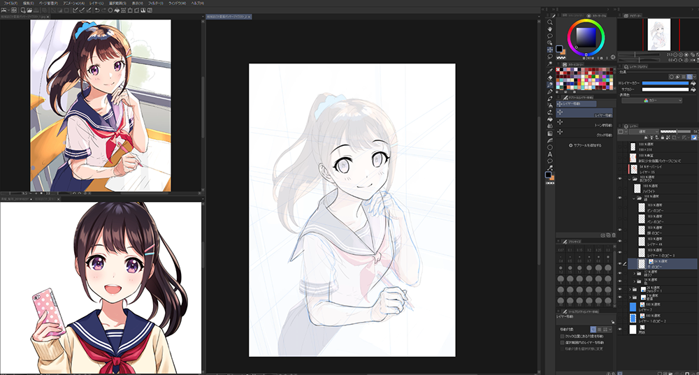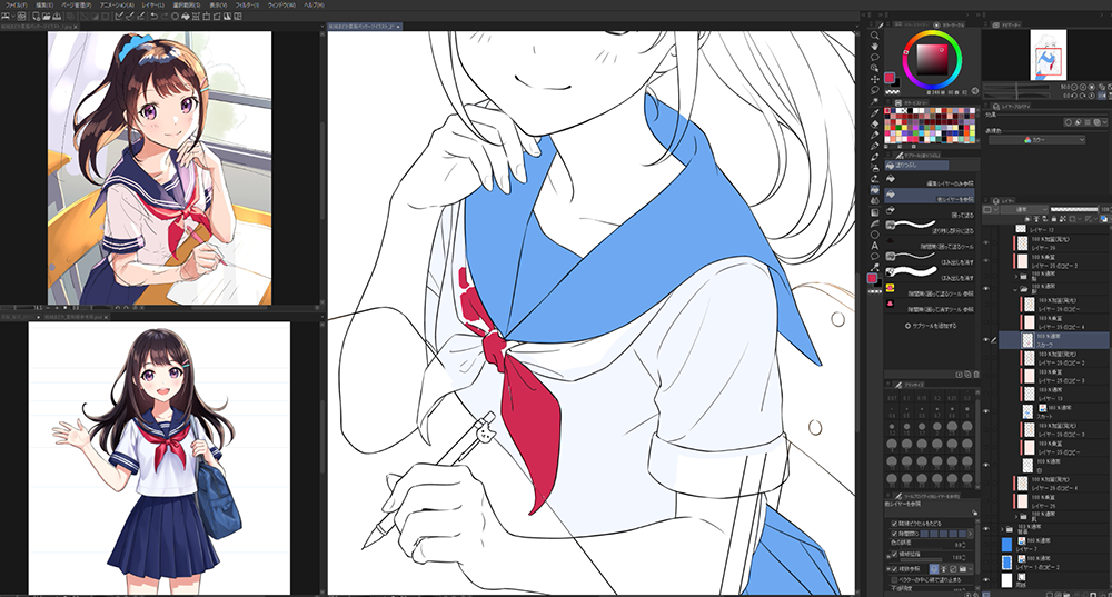 ─今回のイラストを描いているときの画面の配置について教えてください。立ち絵、夏服、冬服など数種類の資料を常に画面に表示しながら描かれていますが、いつも資料やラフをこのように表示しているのでしょうか?