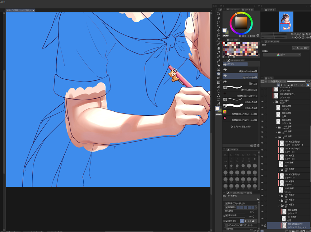 △背景を水色に変更して、肌の形を確認しながら右腕の線画修正を行っている場面。