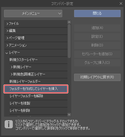 例:[フォルダーを作成してレイヤーを挿入]を選択し、[追加]をクリックすると、コマンドバーにアイコンが追加されます。