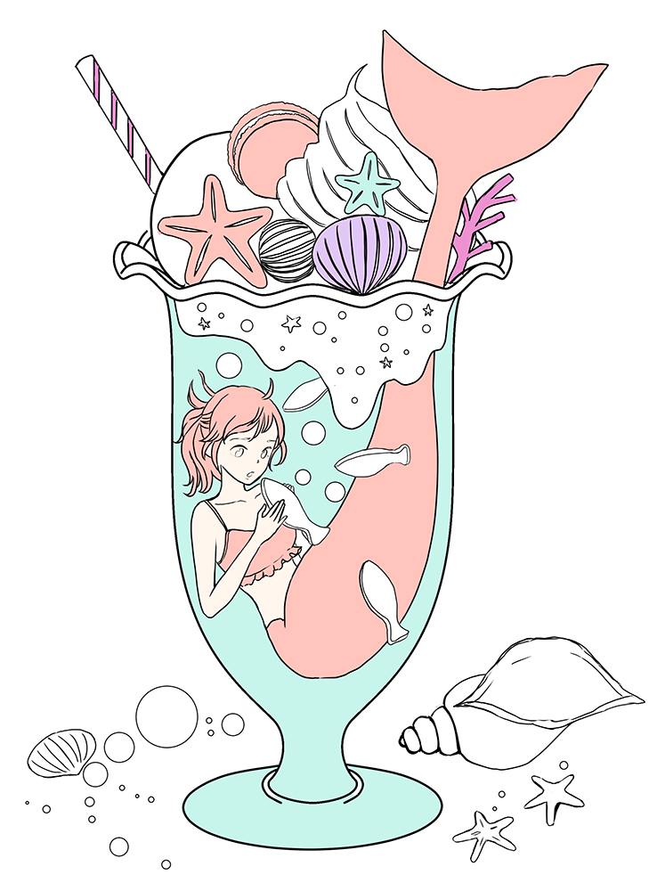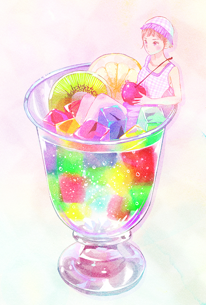 こちらは実際にある喫茶店のメニューを元に、小さくなったキャラクターがプールのように浮かんでいるイラストにしました。
