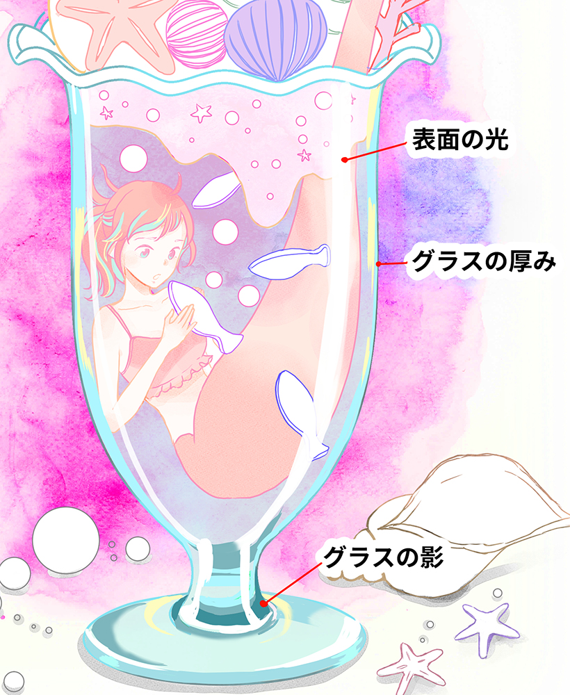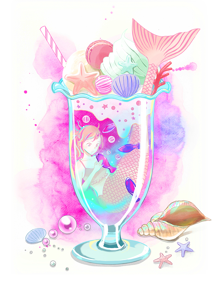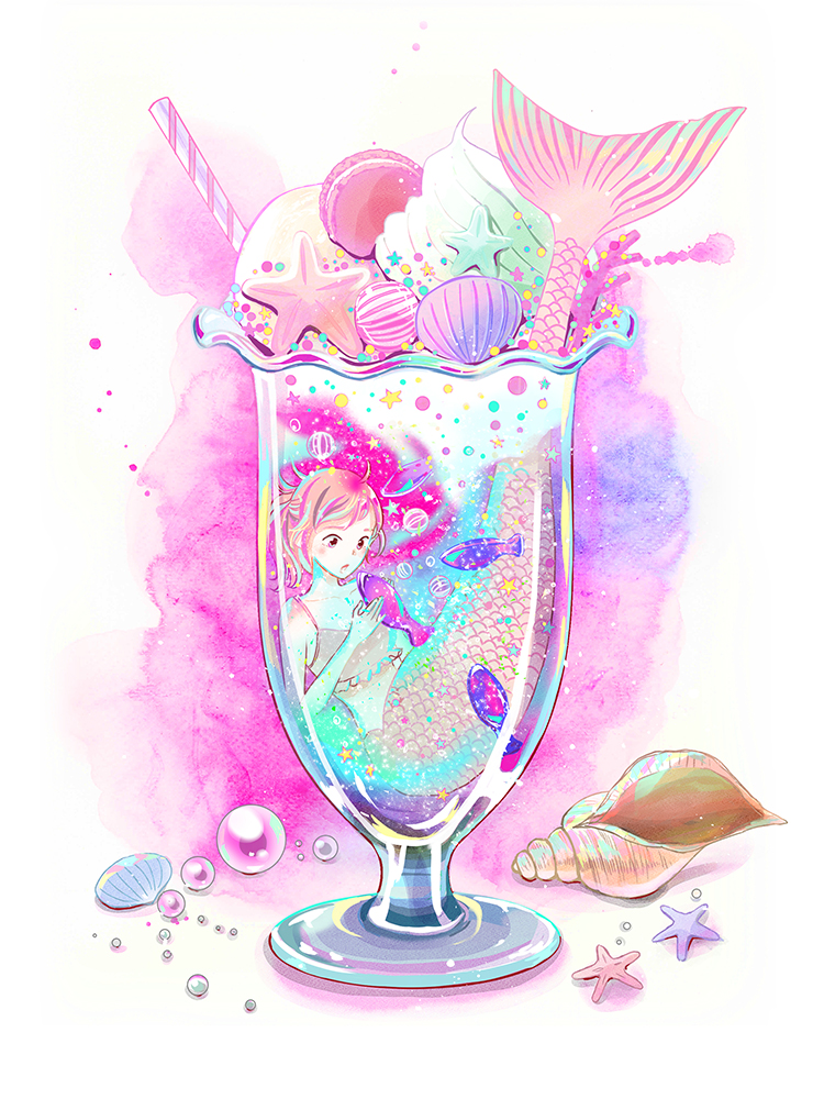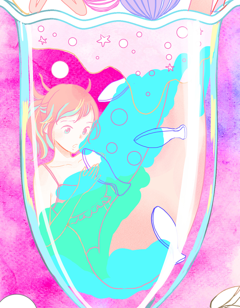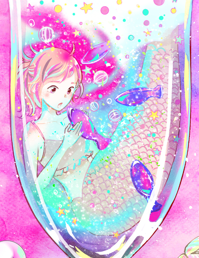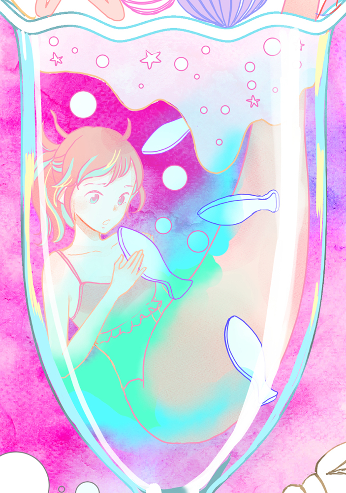 そこから、人魚のひれが実際の人魚のひれになっていて、グラスの中に人魚が入っているイメージを着想しました。