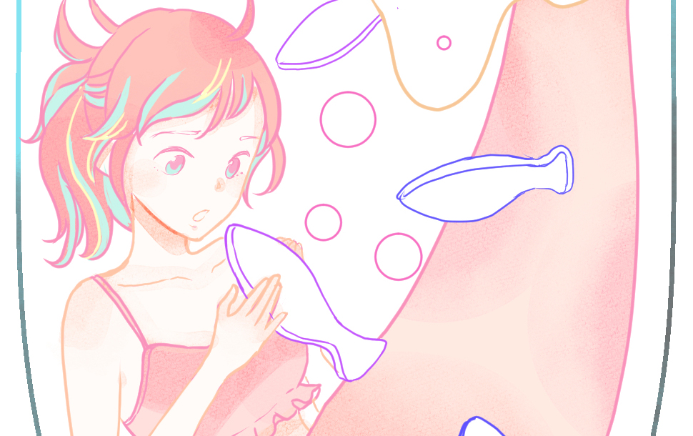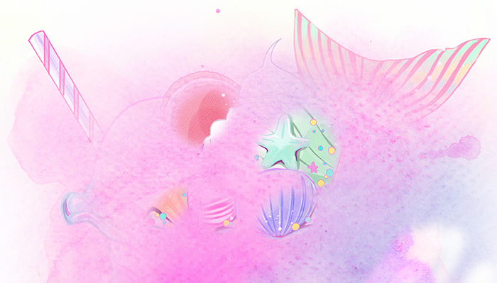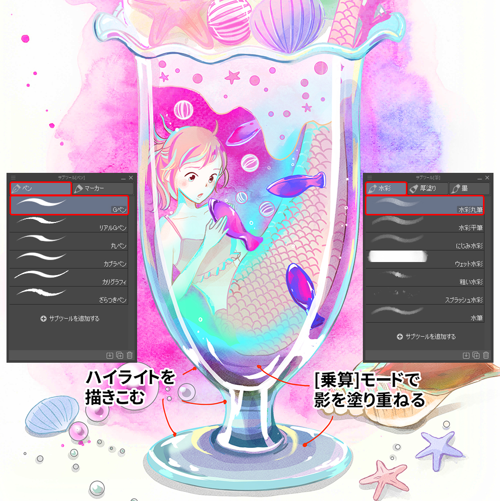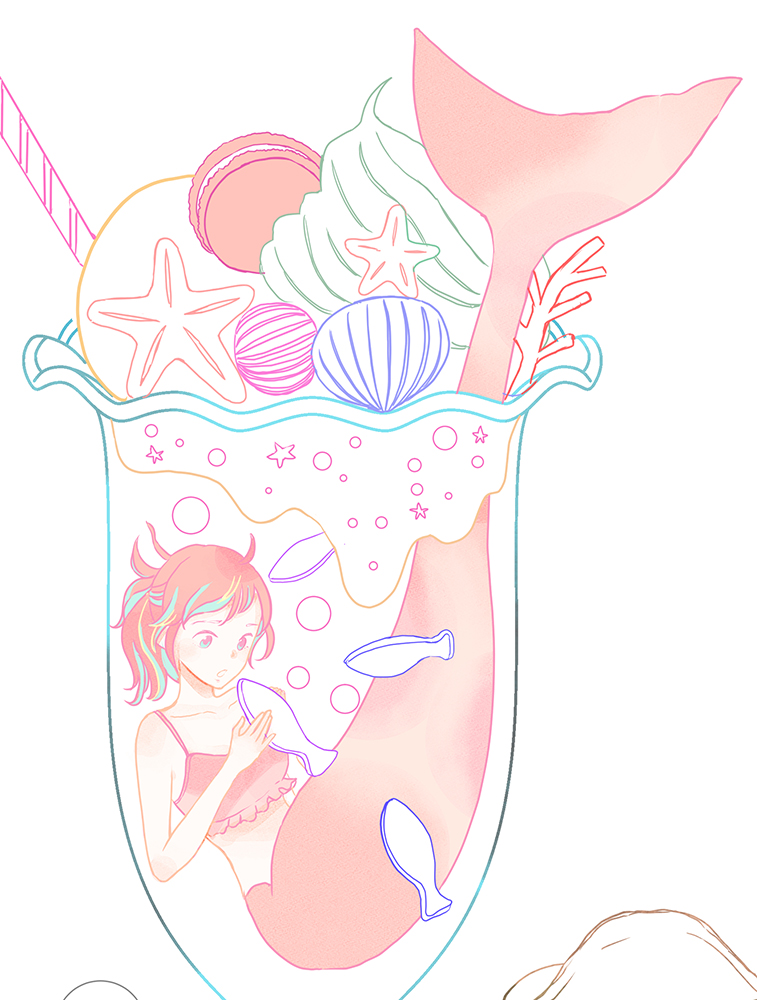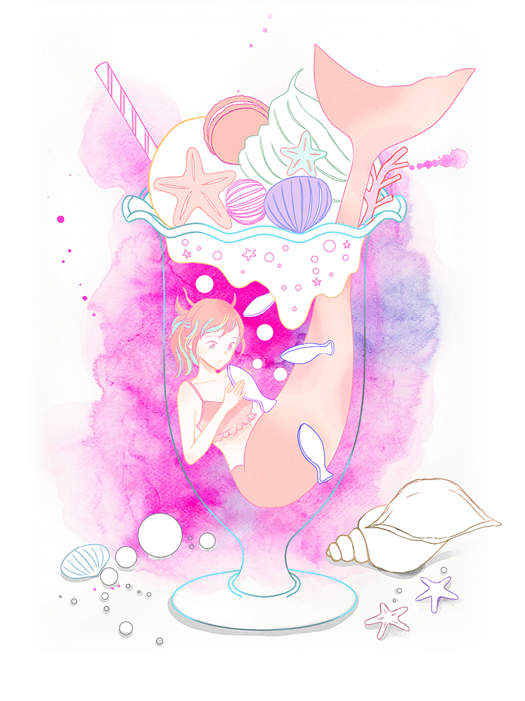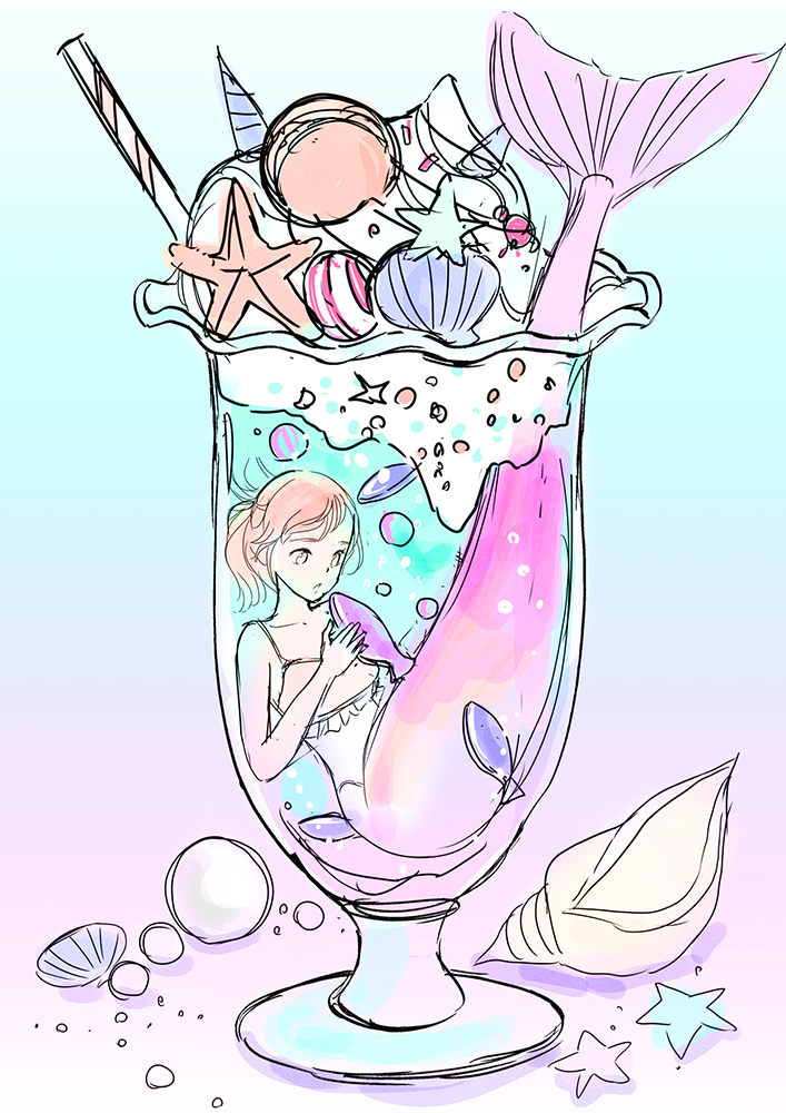 そこから、人魚のひれが実際の人魚のひれになっていて、グラスの中に人魚が入っているイメージを着想しました。