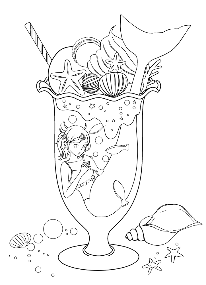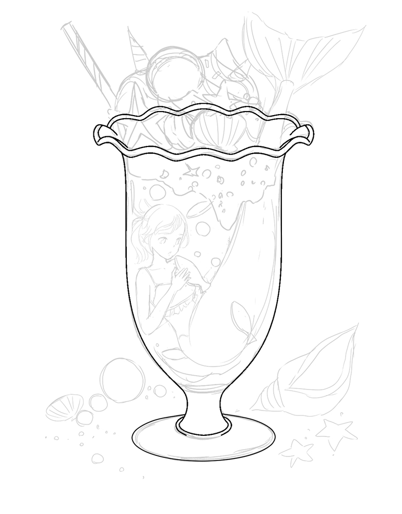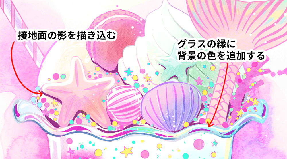 そのほか、小物などを描き込み、ソーダに溶けているクリームに違和感がないように調整しました。