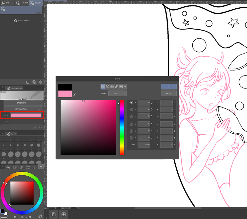 [ツールプロパティ]パレットにある[メインカラー]をクリックして色を選択すると、ベクターレイヤー上の線画の色を一括で変更できます。