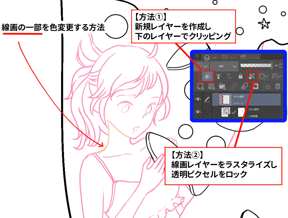 ①線画レイヤーの上に新規レイヤーを作成し、[下のレイヤーでクリッピング]をするか、