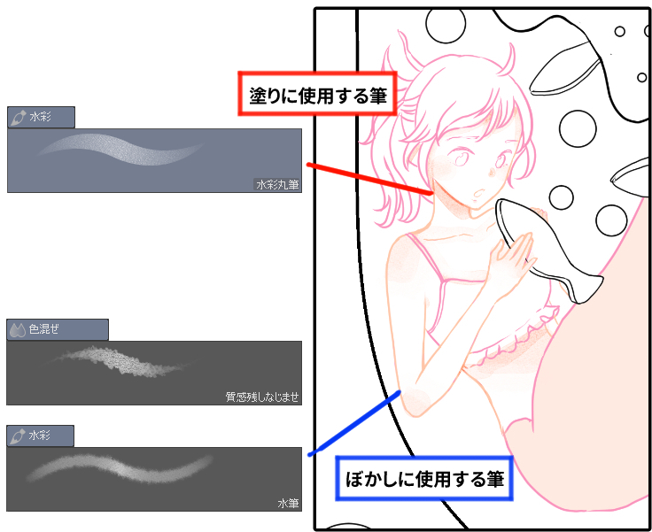 [水彩丸筆]で塗った部分をぼかしたいときには、[色混ぜ]ツール→[質感残しなじませ]を使用するか、[筆]ツール→[水彩]→[水筆]でフチをぼかすと、実際に水彩絵の具で塗った時と同じような表現をすることができます。