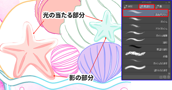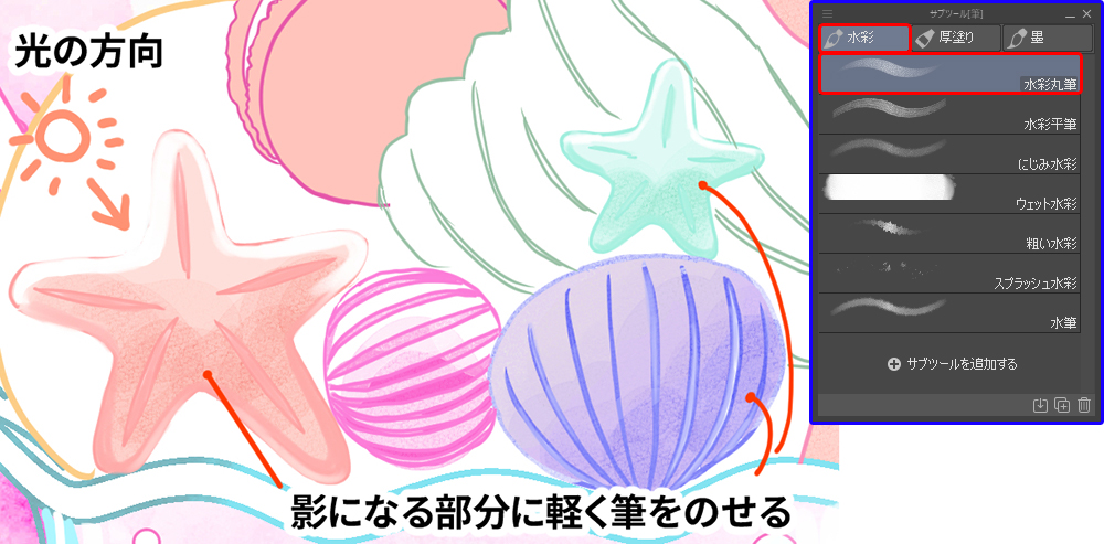 表面は質感を出すため[筆]ツール→[水彩]→[水彩丸筆]で光の当たり方を意識しながら、影の部分に軽く筆をのせます。