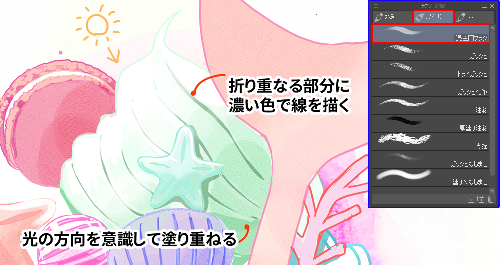 クッキーの厚みの表現は、[筆]ツール→[厚塗り]→[混色円ブラシ]で厚塗りのように塗っていきます。