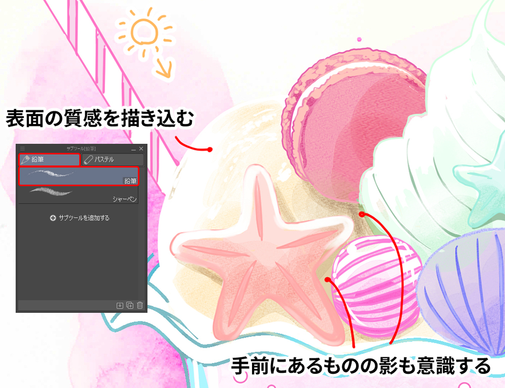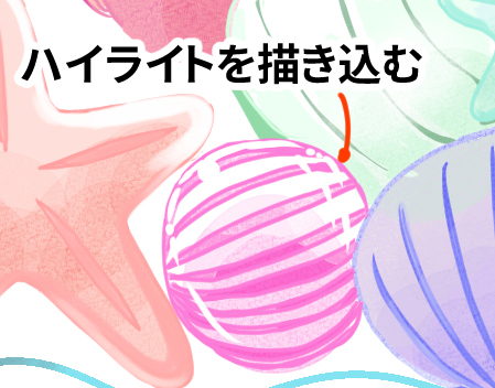 飴はツルツルしているため、影部分に色を乗せたあと、表面に白でハイライトを描き込みます。