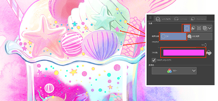 レイヤー最上部に新規レイヤーを作成し、[レイヤープロパティ]パレット→[効果]→[境界効果]を適用して、描画した内容にピンク色のフチがつくように設定します。