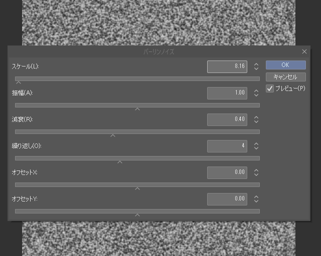 レイヤー最上部に新規レイヤーを作成し、[フィルター]メニュー→[描画]→[パーリンノイズ]
