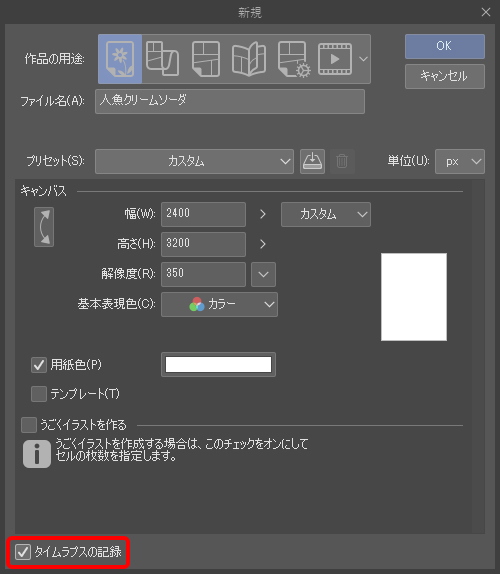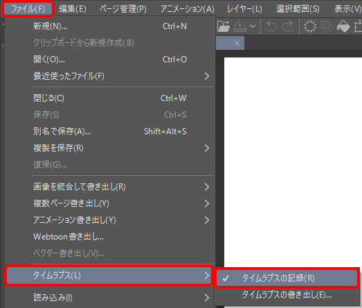 タイムラプスは、[新規]ダイアログの下部にある[タイムラプスの記録]にチェックを入れるか、作業中のファイルの場合は、[ファイル]メニュー→[タイムラプス]→[タイムラプスの記録]から設定ができます。