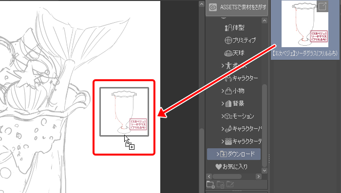 今回、グラスの線画にはCLIP STUDIO ASSETSにある無料の素材「【3次ベジェ】ソーダグラス(フリルふち)」を使用させていただきました。