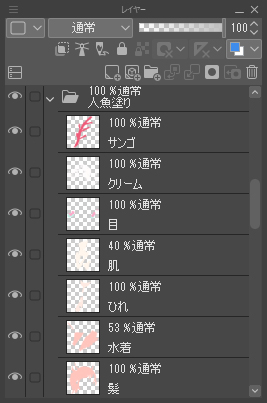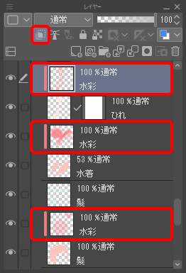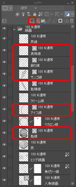 1.で塗った下塗りレイヤーの上に新規レイヤーを作成し、[下のレイヤーでクリッピング]を設定します。