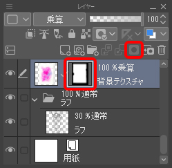 レイヤー最上部に配置し、上からテクスチャの色をかけたい部分以外に[レイヤーマスク]を適用します。