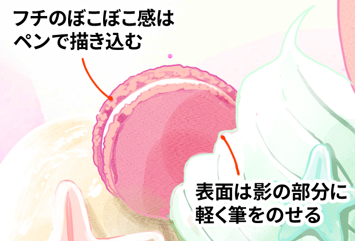クッキーと同じように質感を意識しながら塗り、フチの部分は[Gペン]などの不透明なペンでぼこぼこ感を描き込みます。