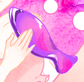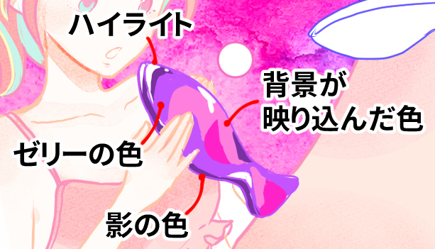 光が強く当たる部分に白のハイライトを置き、ゼリーそのものの色(紫)と背景のテクスチャの色(ピンク)を意識して、アニメ塗りのようにはっきりとした色を塗ります。