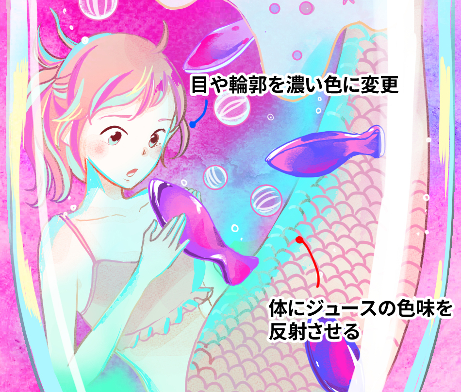 また、ジュースの色の反射を意識し、光の当たる身体の部分に、ジュースと同じ水色を置きました。