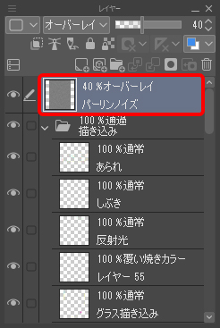 レイヤーの合成モードを[オーバーレイ]、不透明度を40%に設定します。