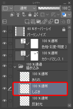 [下のレイヤーでクリッピング]を設定することで、下のレイヤー以外に色がはみ出しません。