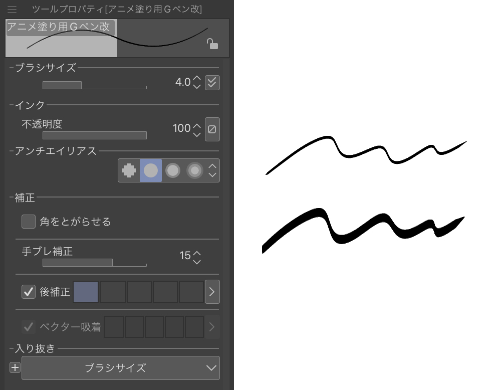 筆圧が弱くても硬めの線が描け、手ブレ補正の値も「15」とやや高めです。手癖に左右されず、かっちりとした線画を描けます。