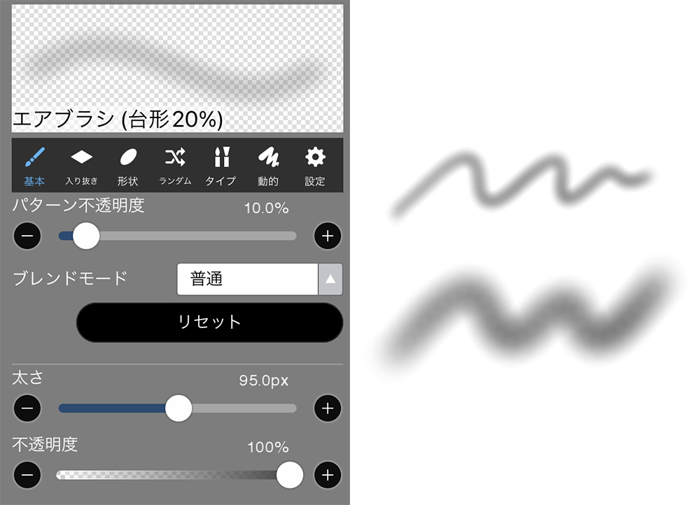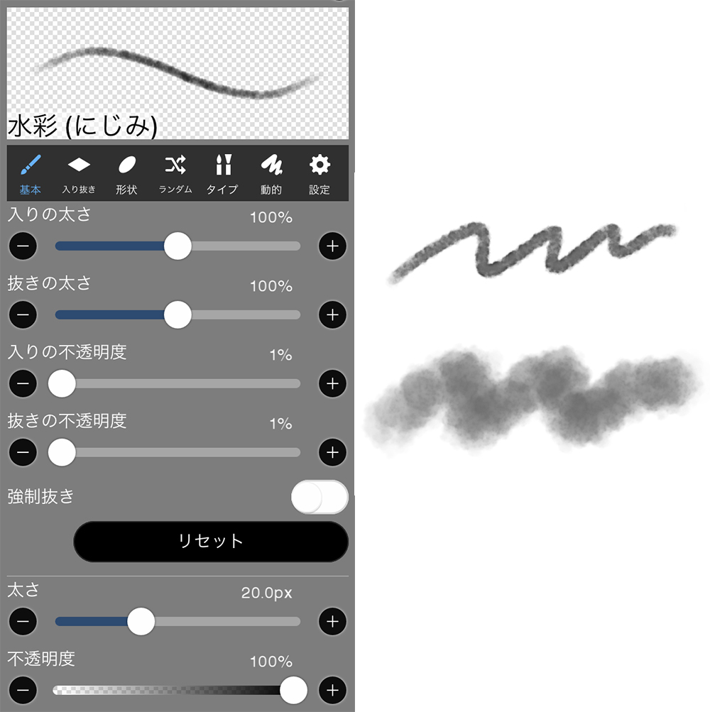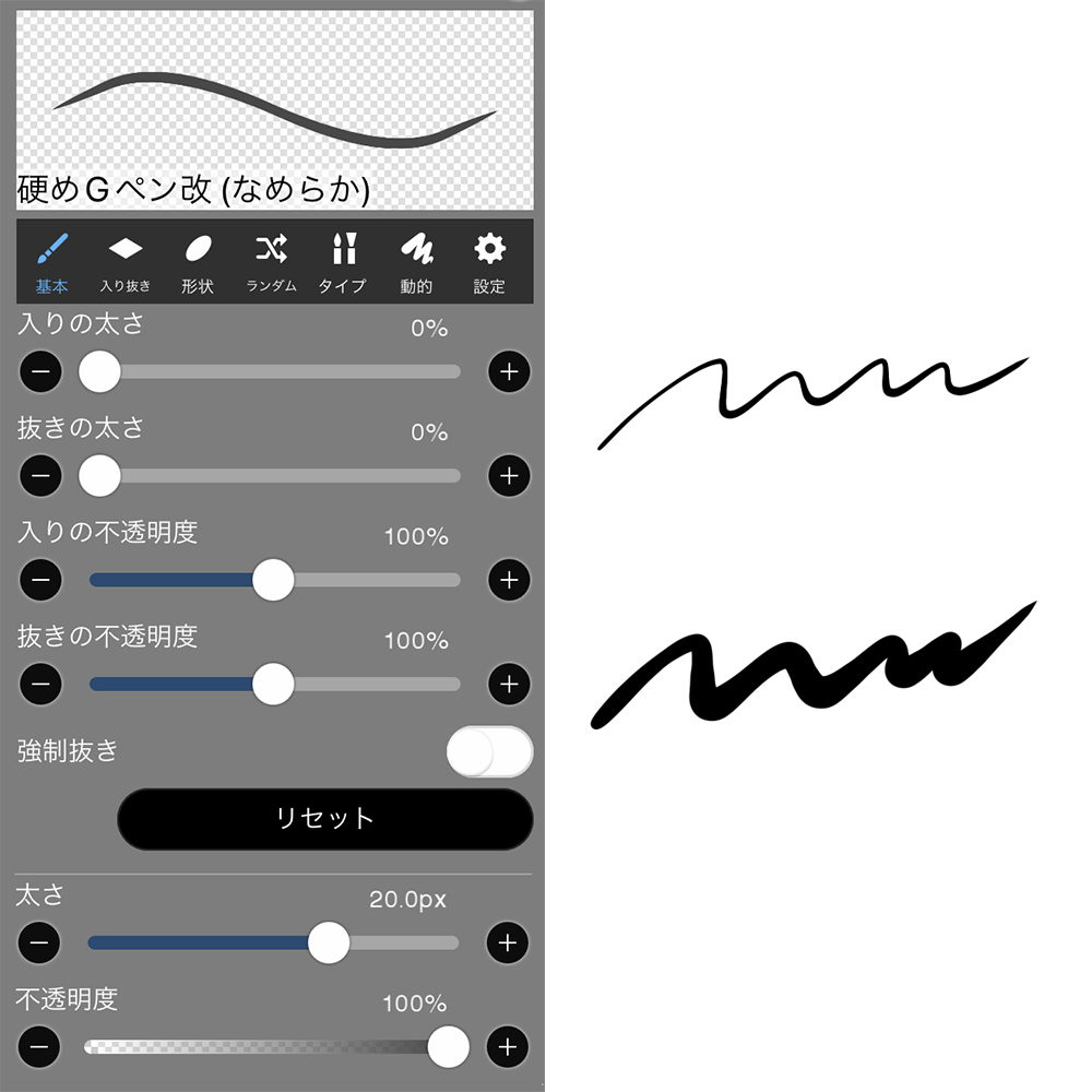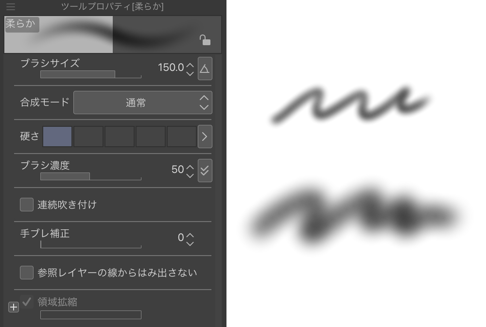 だいたいのデジタルお絵描きアプリで設定できる項目で、塗り方に関係なく調整が必要になる設定です。