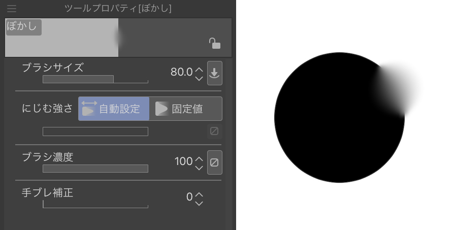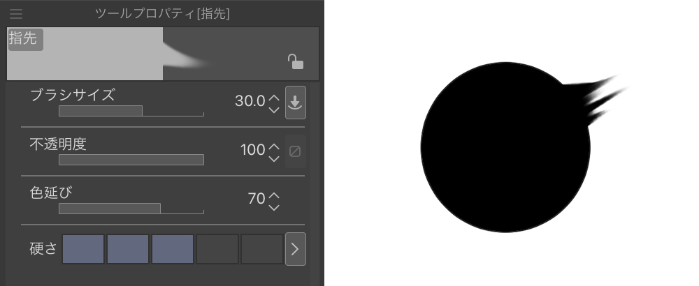 スライダーや数値の入力で、ブラシ自体の透明度を変更することができます。