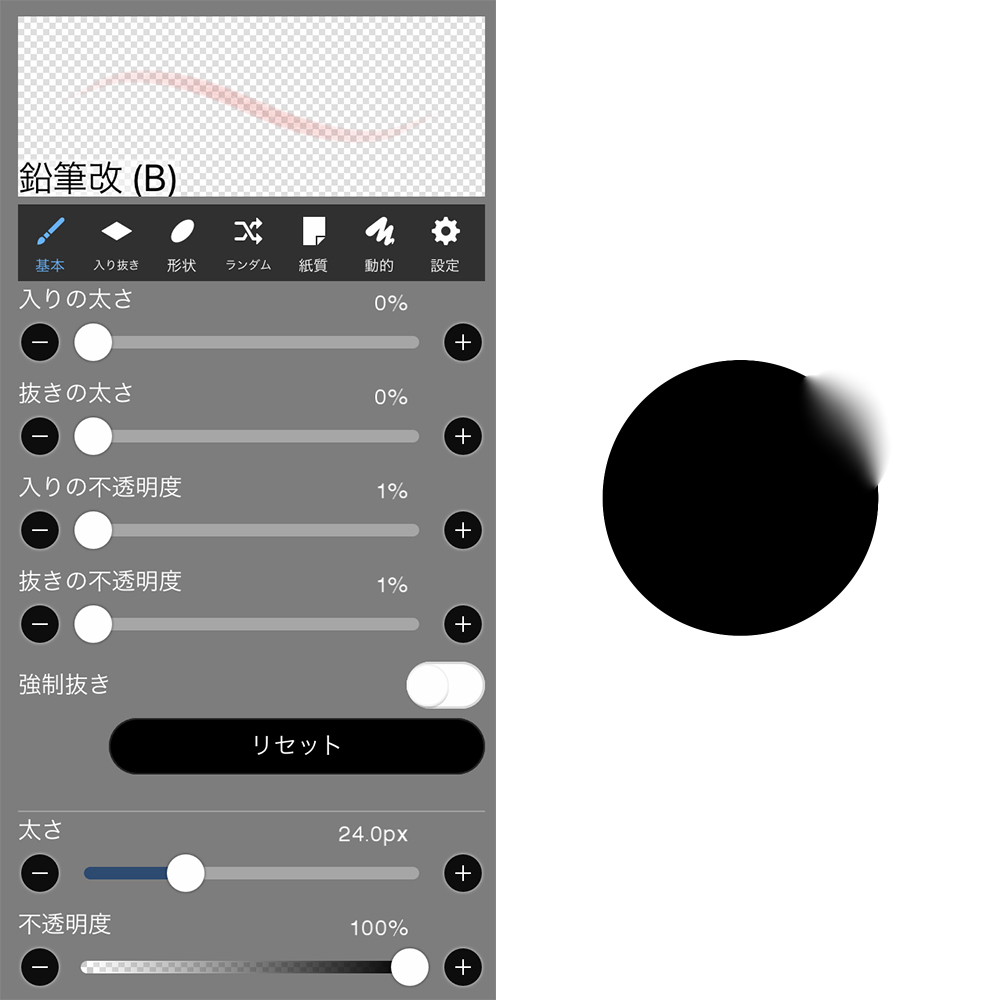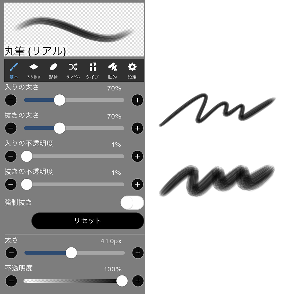 ブラシサイズ・不透明度はもちろん、補正機能や入り抜きのかすれなど、ブラシを細かくカスタムすることが可能です。