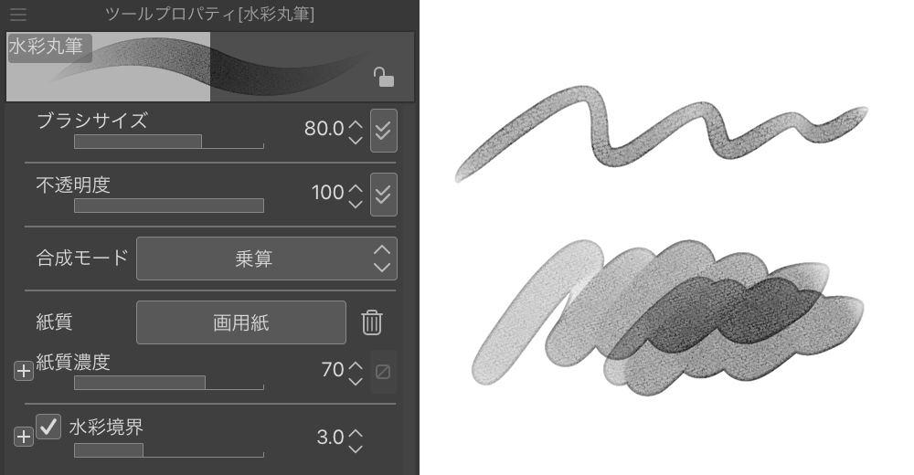 [水彩境界]を[3]に設定することで、自然に縁が強調されるようなブラシになりました。