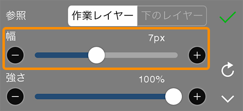 [幅]の数値をスライドすることで、強調具合を調整できます。