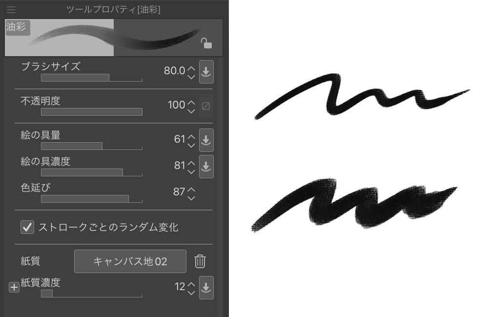 キャンバスに描いているかのような自然なかすれが特徴的なブラシです。