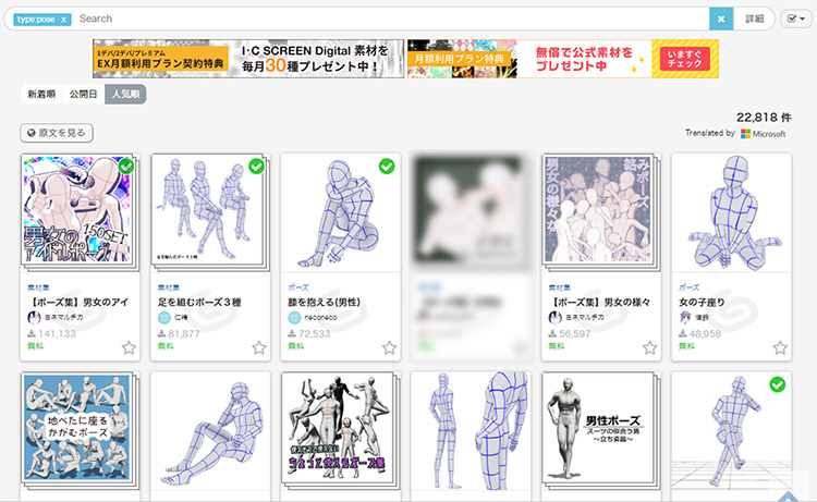 ポーズ素材を検索すると、たくさんのポーズ素材が出てくるので、好きな素材をダウンロードします。