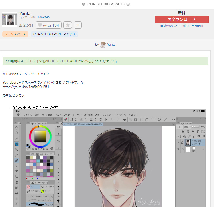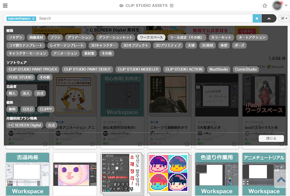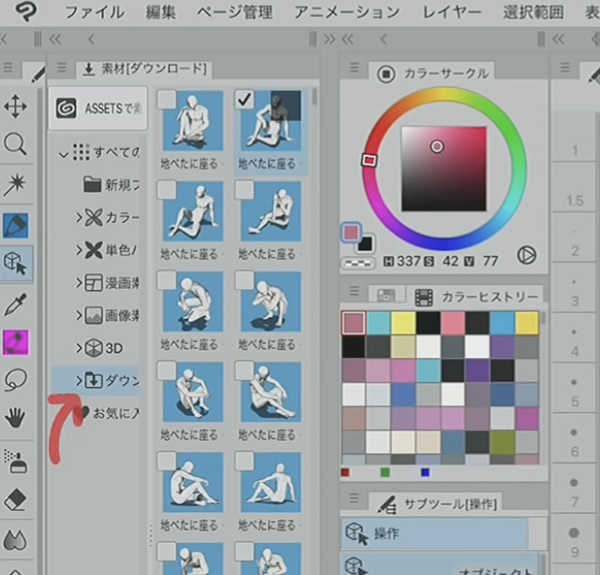 ワークスぺース素材やポーズ素材のほか、ブラシ素材、画像素材、3D素材など、さまざまな素材をダウンロードできます。