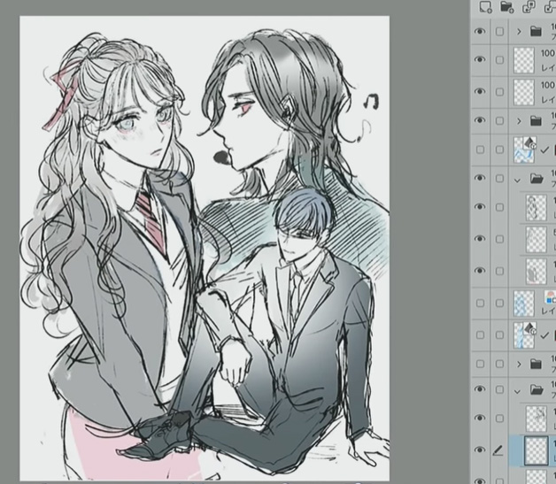 [レイヤープロパティ]パレットの[レイヤーカラー]で下書きを青色に変更して、ここから線画と色塗りに入っていきます。