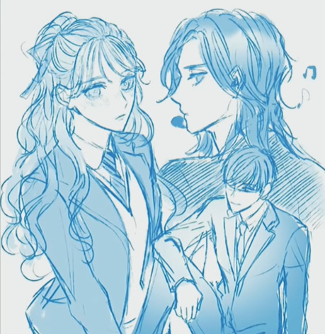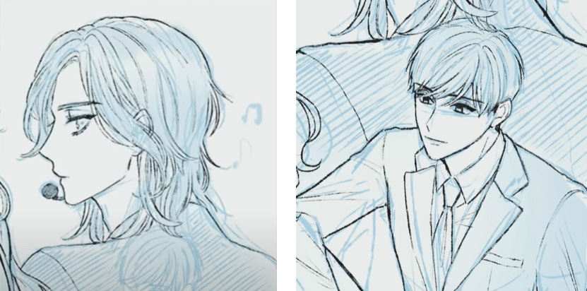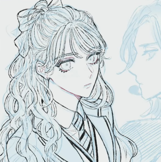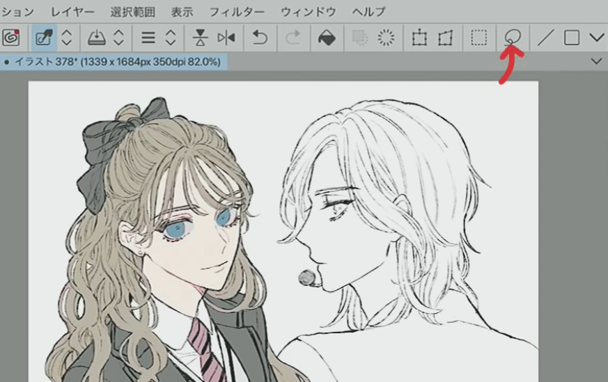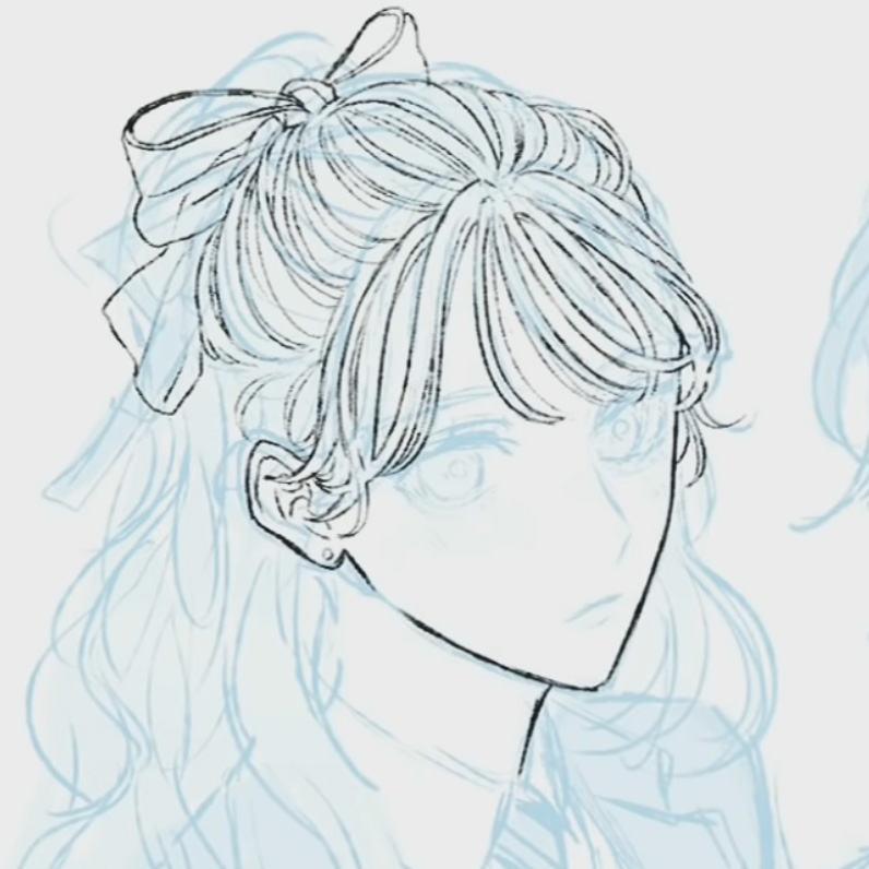 まず輪郭を描いてから、左の女の子の髪の毛を描いていきます。