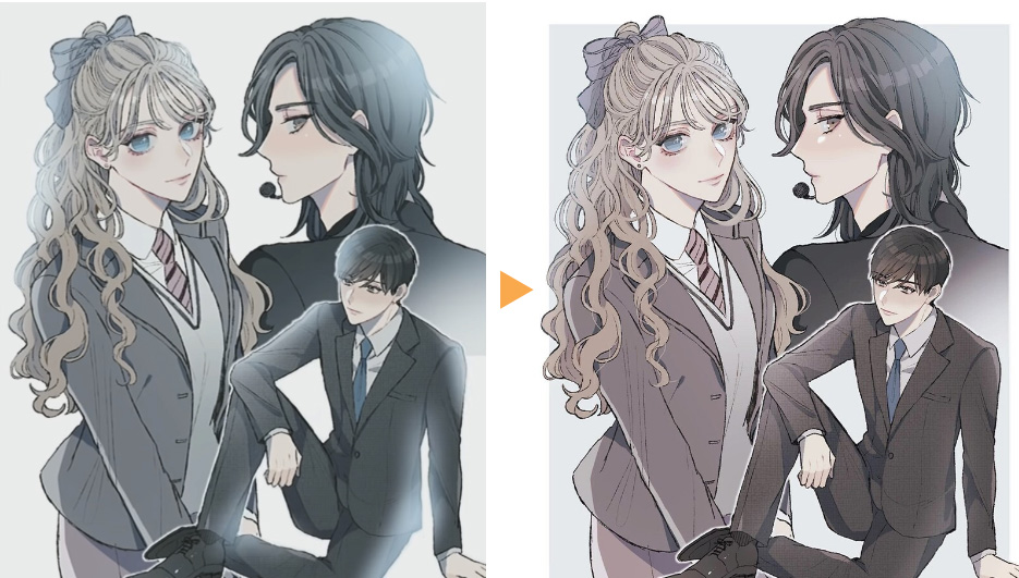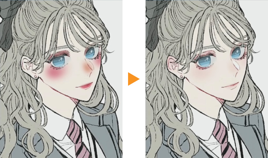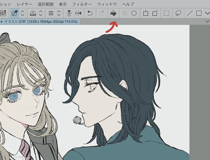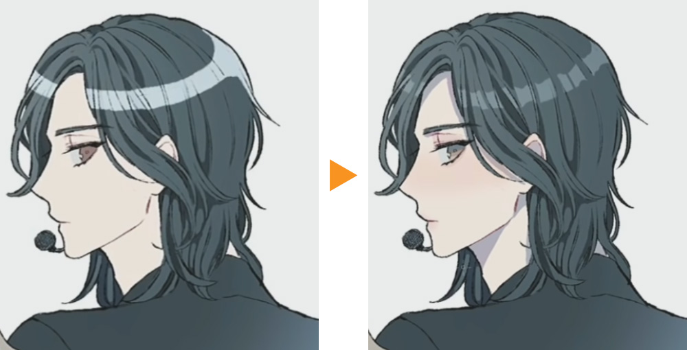 右上の子の髪の毛のハイライトは、帯のように光を描いてから、[消しゴム]ツールで消しながら形を整えました。