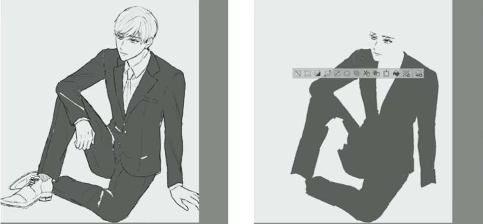 色塗りに入ります。[投げなわ選択]ツールと[塗りつぶし]ツールを使用して、下地の色分けをします。