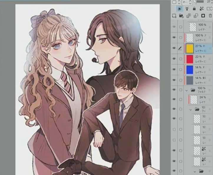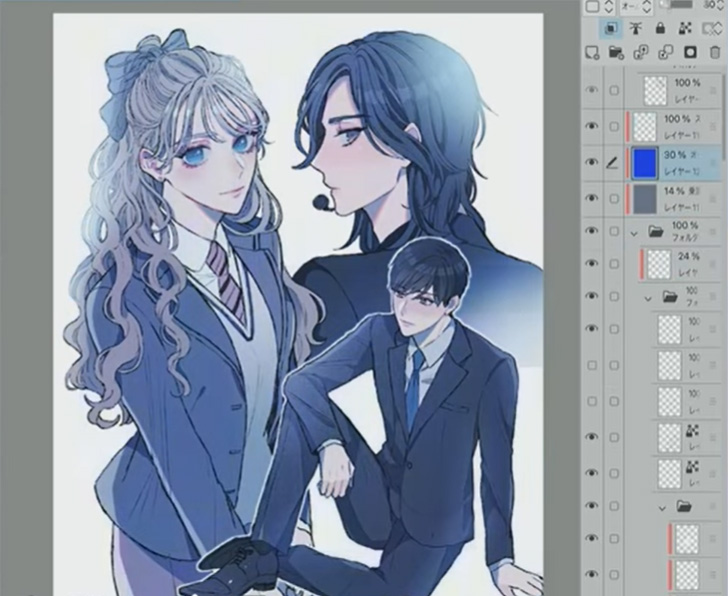 最初は濃い色で塗って、後から色を変えたり、レイヤーの不透明度を下げて見映えを調整していきます。