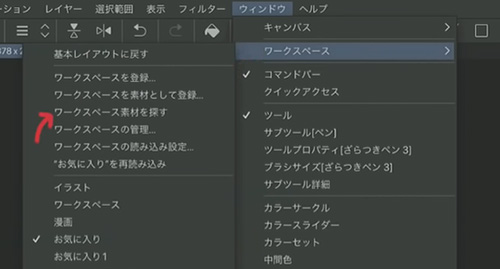 1.画面上にある[ウィンドウ]メニュー→[ワークスペース]から[ワークスペース素材を探す]をタップします。