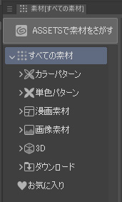[素材]パレットの[ASSETSで素材を探す]をタップして、CLIP STUDIO ASSETSを開きます。