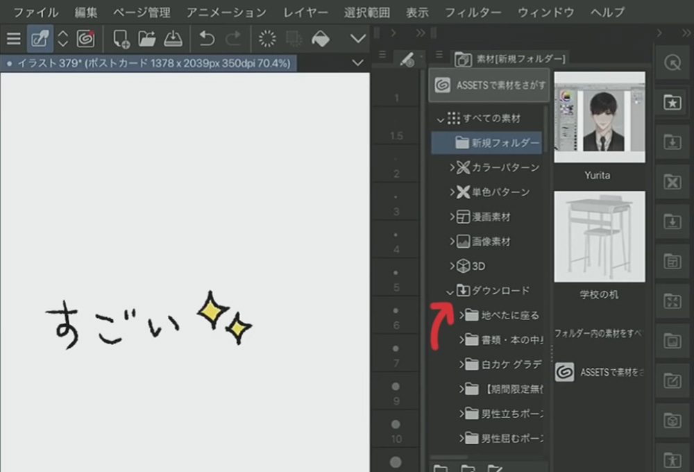 CLIP STUDIO PAINTに戻って[素材]フォルダー→[ダウンロード]の欄を見てみると、素材が保存されていると思います。