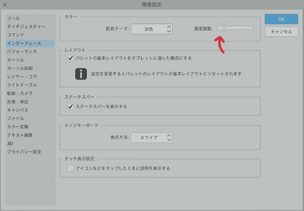 上から4つ目の[インターフェース]にある、[カラー]の配色テーマを[濃色]から[淡色]にすると背景が白くなって文字が黒色になります。
