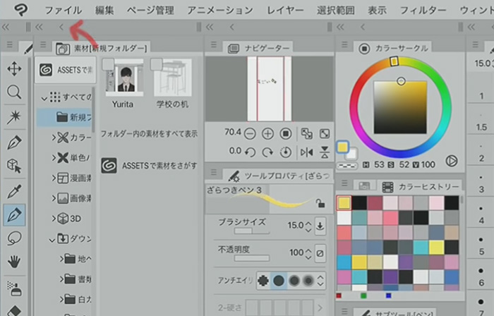 よく使う[ナビゲーター]パレット・[ツールプロパティ]パレット(ペンの設定)・[素材]パレットは、左上の三角ボタン(<)を押すと出てきます。