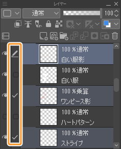 [レイヤー]パレットのレイヤー描画可・不可欄にチェックを入れることで、複数レイヤーを選択した状態になります。